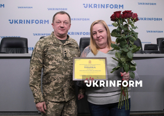 Заступник начальника штабу Командування Сил територіальної оборони Збройних сил України Дмитро Бородавко вручає подяку Мар_qt_яні Рабченюк-Петриченко під час урочистого заходу з нагоди 108-ї річниці від дня заснування Українського національного інформаційного агентства “Укрінформ”, Київ, 16 березня 2026 року.