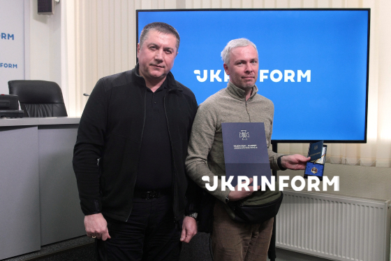 Фотокореспондент Кирило Чуботін (праворуч) тримає відзнаку Національної академії СБУ України під час урочистого заходу з нагоди відзначення 108-ї річниці від дня заснування Українського національного інформаційного агентства “Укрінформ”, Київ, 16 березня 2026 року.
