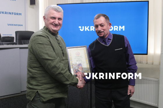 Генеральний директор Укрінформу Сергій Череватий (ліворуч) вручає грамоту Національного університету Цивільного захисту України заступнику начальника управління - начальнику відділу по роботі з персоналом Сергію Анфіногенову під час урочистого заходу з нагоди 108-ї річниці від дня заснування Українського національного інформаційного агентства “Укрінформ”, Київ, 16 березня 2026 року.
