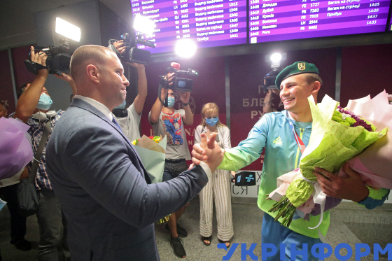 Голова Полтавської облдержадміністрації Олег Синєгубов і український боксер, срібний призер Олімпійських ігор 2020 Олександр Хижняк (зліва направо) під час зустрічі спортсмена після його повернення зі змагань в Токіо до України в Міжнародному аеропорту "Бориспіль", Київ, 12 серпня 2021 року.