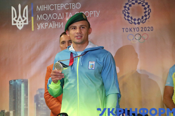 Український боксер, срібний призер Олімпійських ігор 2020 Олександр Хижняк під час пресбрифінгу в межах зустрічі після його повернення зі змагань в Токіо до України демонструє олімпійську медаль в Міжнародному аеропорту "Бориспіль", Київ, 12 серпня 2021 року.