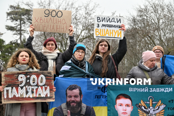Активісти з плакатами нагадують містянам про щоденну хвилину мовчання на честь загиблих від збройної агресії РФ під час традиційної акції "Зупинись. Вшануй пам’ять героїв!", Одеса, 25 лютого 2026 року. Згідно з указом Президента України, вшанування пам’яті оголошується щодня о 9-й ранку в усіх містах України.