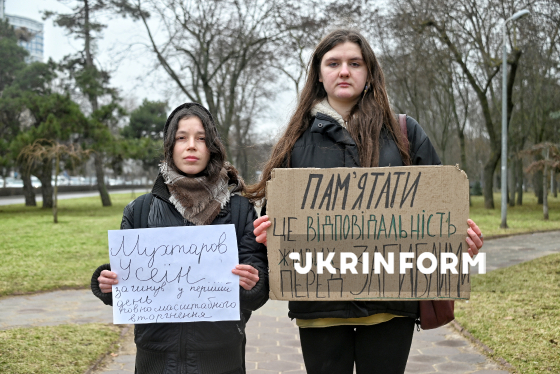 Активістки з плакатами нагадують містянам про щоденну хвилину мовчання на честь загиблих від збройної агресії РФ під час традиційної акції "Зупинись. Вшануй пам’ять героїв!", Одеса, 25 лютого 2026 року. Згідно з указом Президента України, вшанування пам’яті оголошується щодня о 9-й ранку в усіх містах України.