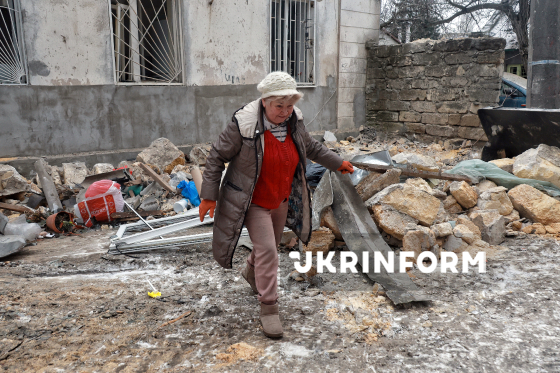 Жінка проходить повз двоповерховий житловий будинок, понівечений внаслідок російської атаки ударними дронами, Одеса, 4 лютого 2026 року. Унаслідок російського обстрілу ударними безпілотниками пошкоджень зазнали житлові будинки, цивільна та промислова інфраструктури, п’ятеро людей отримали травми.