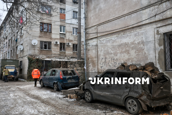 Пошкоджені автомобілі біля двоповерхового житлового будинку, понівеченого внаслідок російської атаки ударними дронами, Одеса, 4 лютого 2026 року. Унаслідок російського обстрілу ударними безпілотниками пошкоджень зазнали житлові будинки, цивільна та промислова інфраструктури, п’ятеро людей отримали травми.