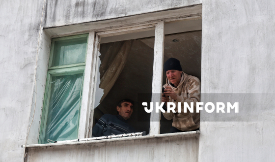 Чоловіки у вікні двоповерхового житлового будинку, понівеченого внаслідок російської атаки ударними дронами, Одеса, 4 лютого 2026 року. Унаслідок російського обстрілу ударними безпілотниками пошкоджень зазнали житлові будинки, цивільна та промислова інфраструктури, п’ятеро людей отримали травми.