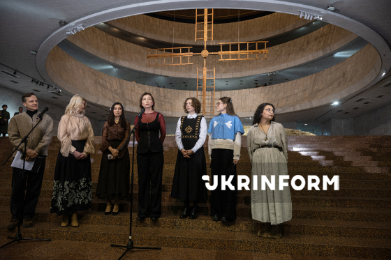 Кураторська група у складі Олексія Ананова, Олени Брайченко, Тетяни Гаук, Аліси Гришанової та Анни Гудімової (зліва направо) та директорка Національного центру "Український дім" Ольга Вієру (друга ліворуч) беруть участь у презентації виставкового проєкту "Хліб", що представляє один із найдавніших і найпотужніших символів України як соціокультурне явище, до експозиції якого увійшли експонати періоду давньої Русі, трипільської кераміки та археологічних знахідок землеробської культури, а також роботи понад 50 українських художників, Київ, 4 грудня 2025 року.