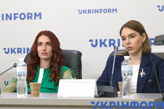 Юристка, засновниця адвокатської компанії Royal Lawyers Анастасія Мокренко та українська захисниця з позивним Жанна дʼАрк, яка стала жертвою домашнього насильства, Євгенія Емеральд (справа наліво) під час презентації інформаційної акції "Говорити, щоб жити: боротьба з домашнім насильством", Київ, 8 листопада 2023 року.