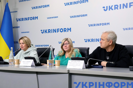 Голова правління ГО "Простір можливостей" Оксана Коляда, представниця Міжнародного фонду "Відродження" Ольга Гальченко та директор з розвитку - заступник виконавчого директора Всеукраїнської асоціації громад Ігор Абрам’юк (зліва направо) під час брифінгу, присвяченого запуску старту Центру підтримки громад, в Українському національному інформаційному агентстві "Укрінформ", Київ, 28 листопада 2024 року.