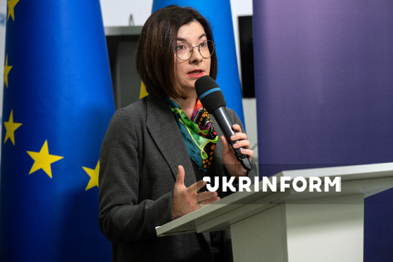 Журналістка, колумністка, виконавча продюсерка Радіо Культура Ірина Славінська виступає з промовою під час форуму до Дня спротиву окупації Автономної Республіки Крим та міста Севастополя "Крим: дім, за який ми боремось" в Українському національному інформаційному агентстві "Укрінформ", Київ, 26 лютого 2026 року.