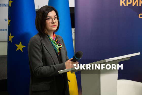 Журналістка, колумністка, виконавча продюсерка Радіо Культура Ірина Славінська виступає з промовою під час форуму до Дня спротиву окупації Автономної Республіки Крим та міста Севастополя "Крим: дім, за який ми боремось" в Українському національному інформаційному агентстві "Укрінформ", Київ, 26 лютого 2026 року.
