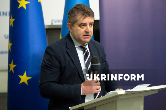 Заступник міністра закордонних справ України Євген Перебийніс виступає з промовою під час форуму до Дня спротиву окупації Автономної Республіки Крим та міста Севастополя "Крим: дім, за який ми боремось" в Українському національному інформаційному агентстві "Укрінформ", Київ, 26 лютого 2026 року.