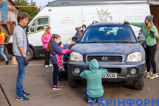Український письменник, волонтер Андрій Любка (ліворуч) під час акції спостерігає за дітьми, які розмальовують придбаний ним у Великій Британії позашляховик для ЗСУ (та названий на честь королеви Єлизавети ІІ з вдячністю за підтримку України) на зібрані волонтерськими організаціями ("Творчі волонтери Ужгорода", "Рух підтримки закарпатських військових" та "Волонтеріат УжНУ") кошти, Ужгород, 4 жовтня 2022 року.