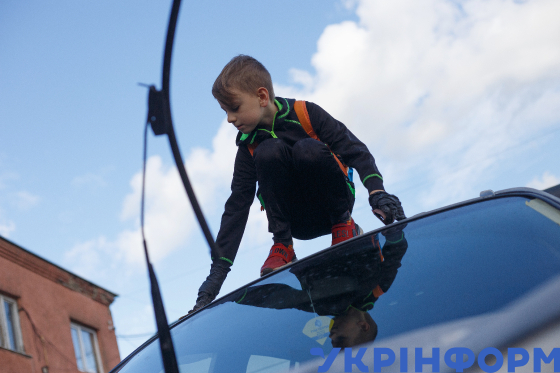 Хлопчик під час акції по розмальовуванню придбаного українським письменником, волонтером Андрієм Любкою у Великій Британії позашляховика для ЗСУ (та названого на честь королеви Єлизавети ІІ з вдячністю за підтримку України) на зібрані волонтерськими організаціями ("Творчі волонтери Ужгорода", "Рух підтримки закарпатських військових" та "Волонтеріат УжНУ") кошти, Ужгород, 4 жовтня 2022 року.