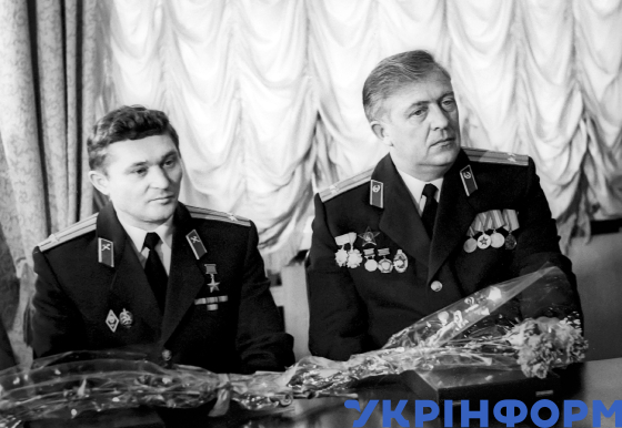 Підполковник Георгій Нагаєвський та Герой Радянського Союзу, офіцер-пожежник Леонід Телятников (справа наліво) отримують медалі Інституту святого Марка за героїчний подвиг під час ліквідації наслідків аварії на ЧАЕС, Київ, 28 квітня 1988 року. Фото Олега Диканя.