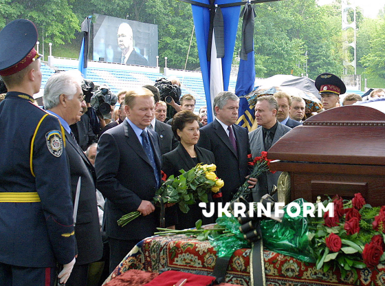 Церемонія прощання з видатним футбольним тренером України Валерієм Лобановським на столичному стадіоні "Динамо", у якій узяли участь Президент України Леонід Кучма та Прем’єр-міністр України Анатолій Кінах, Київ, 14 травня 2002 року. Фото Валерія Соловйова.