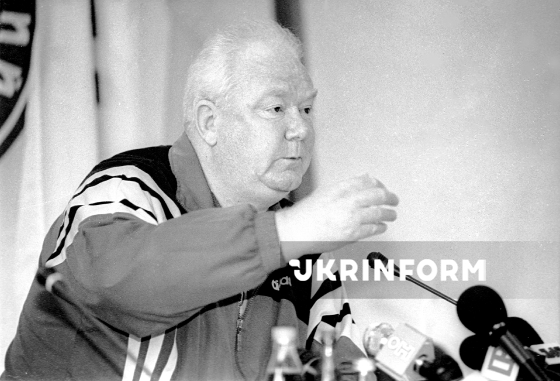 Заслужений тренер України, головний тренер збірної команди України з футболу Валерій Лобановський спілкується з журналістами під час пресконференції на тренувальній базі футбольної команди київського "Динамо" в Конча-Заспі, Київ, 12 травня 1999 року. Фото Володимира Фаліна.
