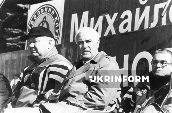 Головний тренер київського "Динамо" Валерій Лобановський та Прем’єр-міністр України Валерій Пустовойтенко (зліва направо) під час презентації команди – учасниці Ліги чемпіонів, що відбулась уперше в історії українського футболу на Майдані Незалежності, Київ, 20 вересня 1997 року. Фото Валерія Скиби.