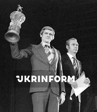 Старший тренер команди "Динамо" (Київ) Валерій Лобановський (праворуч) та капітан динамівців Володимир Бессонов із перехідним призом Спорткомітету СРСР під час нагородження футболістів, Київ, 26 грудня 1980 року. Фото Володимира Репіка та Юрія Хромушина.