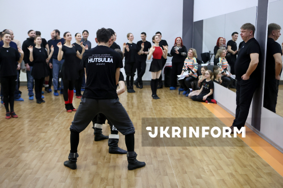 Генеральний директор - художній керівник Національного академічного гуцульського ансамблю пісні та танцю "Гуцулія" Василь Шеремета (праворуч) спостерігає за учасниками колективу в межах інтерв’ю кореспонденту Українського національного інформаційного агентства "Укрінформ", Івано-Франківськ, 15 січня 2026 року.