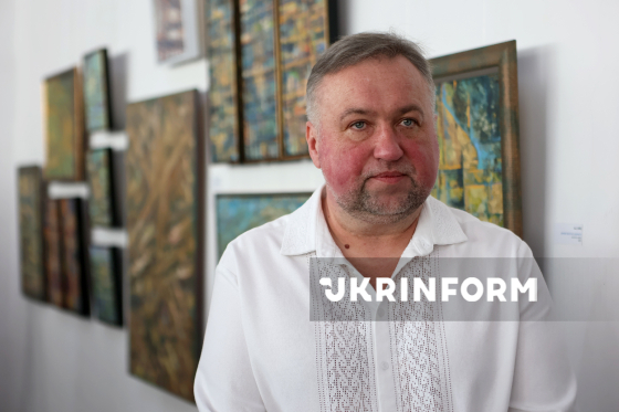 Автор виставки, доктор мистецтвознавства, професор Олег Чуйко бере участь у відкритті виставки живопису, графіки та розпису на шовку “Перехід” у виставковій залі Івано-Франківської обласної організації Національної спілки художників України, Івано-Франківськ, 12 березня 2026 року.