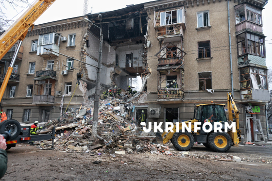 Рятувальники спільно з комунальними службами вручну розбирають завали житлового будинку, де внаслідок російської дронової атаки обвалилися квартири з четвертого по другий поверх, Одеса, 27 січня 2026 року. У ніч на 27 січня росіяни атакували ударними дронами Одесу. У місті зафіксовані серйозні пошкодження об’єктів інфраструктури. Постраждало 22 людини, серед них 14 - отримали поранення легкого ступеня тяжкості. На місцях влучань тривають пошуково-рятувальні роботи.