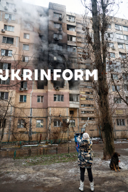 Жінка фотографує дев’ятиповерховий житловий будинок, з квартир якого валить чорний дим від пожежі внаслідок російської дронової атаки, Одеса, 27 січня 2026 року. У ніч на 27 січня росіяни атакували ударними дронами Одесу. Постраждали житлові будинки, зруйновано квартири та виникли пожежі. Під час пошуково-рятувальних робіт на місці влучання у Пересипському районі міста під завалами виявили тіло людини.