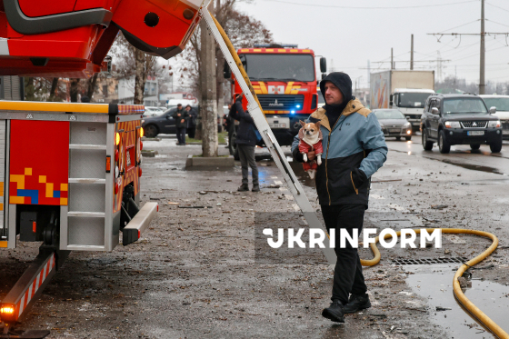Чоловік з псом проходить повз пожежну машину неподалік дев’ятиповерхового житлового будинку, де внаслідок російської дронової атаки спалахнула пожежа, Одеса, 27 січня 2026 року. У ніч на 27 січня росіяни атакували ударними дронами Одесу. Постраждали житлові будинки, зруйновано квартири та виникли пожежі. Під час пошуково-рятувальних робіт на місці влучання у Пересипському районі міста під завалами виявили тіло людини.