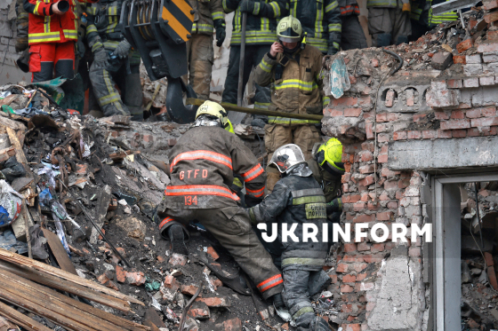 Рятувальники спільно з комунальними службами у пошуках людей вручну розбирають завали житлового будинку, де внаслідок російської дронової атаки обвалилися квартири з четвертого по другий поверх, Одеса, 27 січня 2026 року. У ніч на 27 січня російські терористи масовано атакували Одесу ударними безпілотниками. У низці багатоповерхових будинків було зруйновано та пошкоджено десятки квартир, понівечено фасади, вибито вікна. Кількість загиблих внаслідок атаки зросла до трьох осіб.