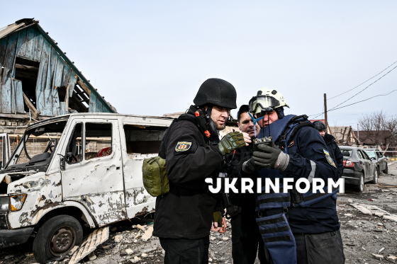 Правоохоронці спільно з рятувальниками працюють на місці падіння російського безпілотника у приватному секторі в одному з районів Запоріжжя, 21 березня 2026 року. Внаслідок обстрілу було зруйновано приватний житловий будинок, загинуло двоє мирних жителів, ще кілька людей отримали поранення, серед них - діти.