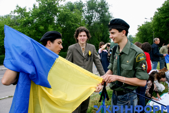 Пластуни Національної скаутської організації України з нагоди 75-х роковин Голодомору в Україні готуються до проведення акції "33 хвилини" біля пам’ятного знака "Жертвам Голодомору 1932-1933 років", Кіровоград (нині Кропивницький), 14 червня 2008 року. Фото Ігоря Філіпенка.
