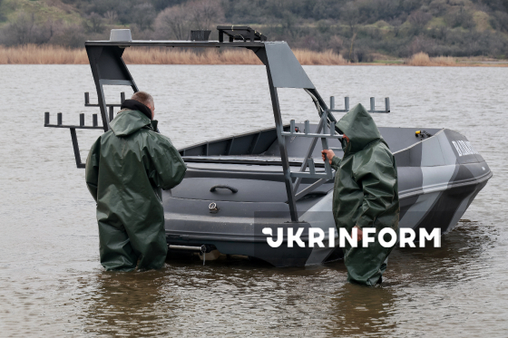 Військові поруч із катером-дроном Barracuda, що проходить випробування на півдні України, 30 березня 2026 року. Безекіпажний катер Barracuda - багатофункціональний надводний дрон, розроблений бійцями однойменного підрозділу 40-ї окремої бригади берегової оборони, що входить до складу 30-го корпусу морської піхоти ВМС ЗСУ. Катер обладнаний сучасною системою трекінгу та дистанційним керуванням, а також елементами штучного інтелекту.