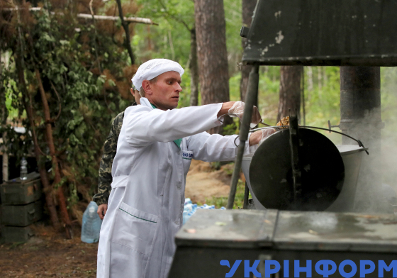 Кухар на польовій кухні готує їжу військовим під час проведення вишколу особового складу підрозділів 114-ї бригади Сил територіальної оборони Збройних сил України та Бучанського добровольчого формування територіальних громад (ДФТГ) на тренувальному полігоні, Київська область, 13 липня 2022 року.