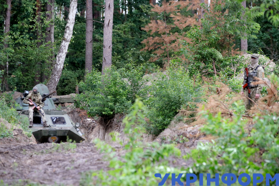 Підрозділи 114-ї бригади Сил територіальної оборони Збройних сил України та Бучанського добровольчого формування територіальних громад (ДФТГ) відпрацьовують захоплення бронетранспортера (БТР), який виїжджає з окопу, під час вишколу особового складу на тренувальному полігоні, Київська область, 13 липня 2022 року.