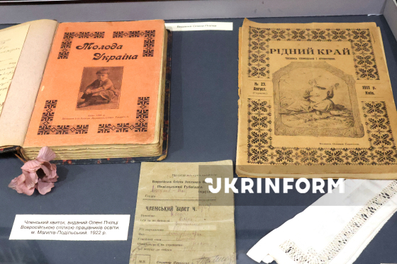 Експонати виставки "Емансипатки", присвяченої жінкам, які творили нову культуру освіти й професійної самореалізації в Україні на межі XIX - початку XX століття, що експонується у Меморіальному будинку Лесі Українки Музею видатних діячів української культури, Київ, 1 квітня 2026 року. В основі експозиції представлені особисті речі жінок родини Косачів (Олени Пчілки, її доньок і невістки), унікальні фотографії, дипломи та атестати жіночих навчальних закладів того часу тощо. Окремий розділ складають експонати з приватної колекції вчителя історії, краєзнавця, колекціонера Петра Яковенка (підручники, документи, зошити), вивезені з Музею освіти окупованої Горлівки, що демонструють розвиток жіночої освіти в Україні.