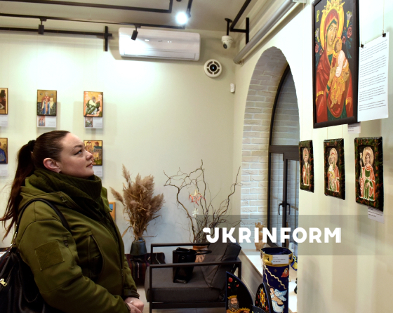 Відвідувачка роздивляється експонати виставки робіт студентів й випускників циклової комісії "Образотворче мистецтво" Тульчинського фахового коледжу культури "Світлопис: пошук втраченого світла" з нагоди Різдва в артпросторі "ЕтноЧари", Вінниця, 23 грудня 2025 року.