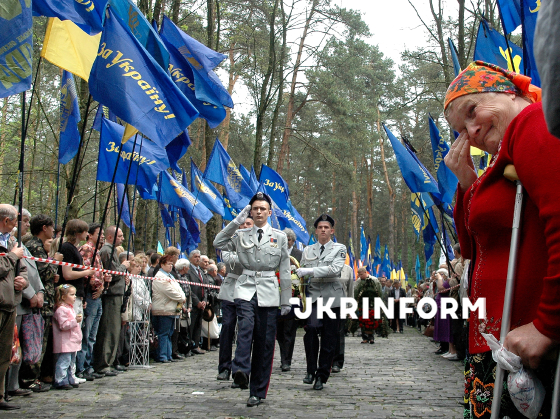 Учасники мітингу-реквієму з нагоди Дня пам’яті жертв політичних репресій в Україні беруть участь у церемонії покладання квітів до Монумента жертвам комуністичного режиму на території Національного історико-меморіального заповідника "Биківнянські могили", Київ, 16 травня 2010 року. Фото Володимира Фаліна.
