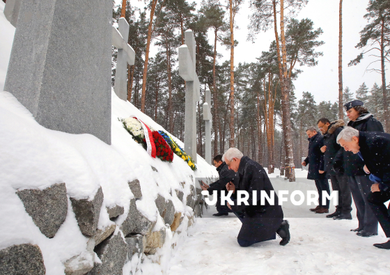 Міністр закордонних справ Республіки Польща Яцек Чапутович та міністр закордонних справ України Павло Клімкін (у центрі справа наліво) біля Братської могили вшановують пам’ять жертв радянських масових політичних репресій на території Національного історико-меморіального заповідника "Биківнянські могили", Київ, 1 грудня 2018 року. Фото Володимира Тарасова.