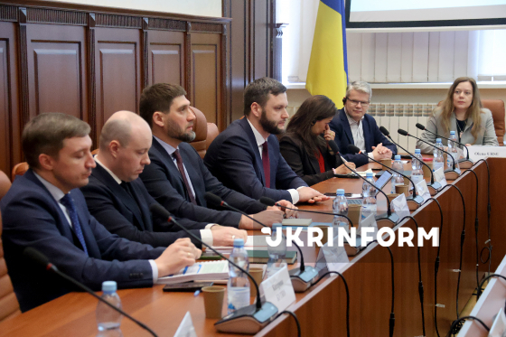 Голова Національного агентства з питань запобігання корупції Віктор Павлущик і його заступники Микола Корнелюк, Сергій Гупяк і Дмитро Калмиков (справа наліво) беруть участь у заході "Відкрита розмова з НАЗК: результати, виклики, пріоритети", ініційованому з нагоди 11-ї річниці з початку роботи Національного агентства та екватора чотирирічної каденції голови НАЗК Віктора Павлущика, у приміщенні агентства, Київ, 19 березня 2026 року.