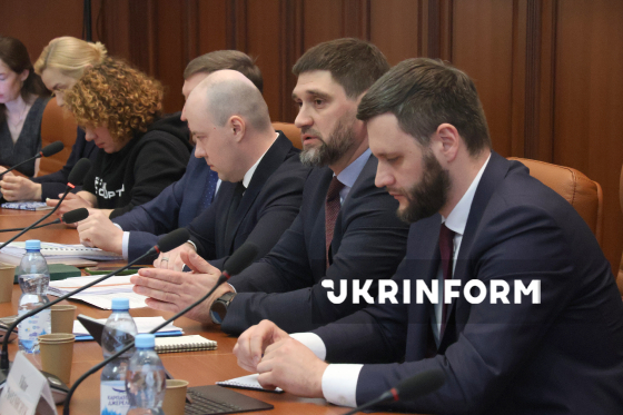 Голова Національного агентства з питань запобігання корупції Віктор Павлущик і його заступники Микола Корнелюк, Сергій Гупяк і Дмитро Калмиков (справа наліво) беруть участь у заході "Відкрита розмова з НАЗК: результати, виклики, пріоритети", ініційованому з нагоди 11-ї річниці з початку роботи Національного агентства та екватора чотирирічної каденції голови НАЗК Віктора Павлущика, у приміщенні агентства, Київ, 19 березня 2026 року.