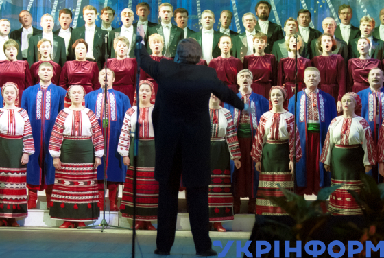 Учасники Українського національного хору імені Верьовки під час зборів представників громадськості та іноземних гостей із нагоди закриття ЧАЕС виконують молитву за Україну в Національному палаці "Україна", Київ, 15 грудня 2000 року. Фото Сергія Кузнецова.