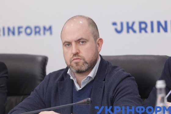 Заступник голови АРМА з питань цифрового розвитку, цифрових трансформацій і цифровізації (CDTO) Станіслав Петров під час засідання комісії з питань проведення конкурсного відбору юридичних осіб, які здійснюють реалізацію арештованих активів, в Українському національному інформаційному агентстві "Укрінформ", Київ, 20 березня 2024 року.