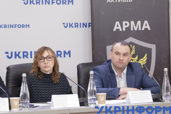 Начальниця відділу аналітично-статистичного забезпечення та контролю за реалізацією арештованого майна Управління контролю за діяльністю органів та осіб, які здійснюють примусове виконання рішень, департаменту державної виконавчої служби Міністерства юстиції України Руслана Велем та начальник четвертого відділу Управління менеджменту активів центрального апарату АРМА Сергій Гуриненко під час засідання комісії з питань проведення конкурсного відбору юридичних осіб, які здійснюють реалізацію арештованих активів, в Українському національному інформаційному агентстві "Укрінформ", Київ, 20 березня 2024 року.