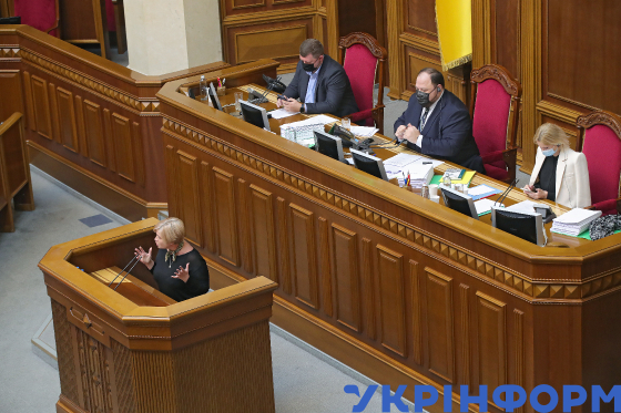 Голова Верховної Ради України Руслан Стефанчук (у центрі), перший заступник Голови ВРУ Олександр Корнієнко, заступниця Голови ВРУ Олена Кондратюк (праворуч), народна депутатка України від партії “Європейська солідарність” Ірина Геращенко за трибуною під час засідання Верховної Ради України IX скликання, Київ, 5 листопада 2021 року.