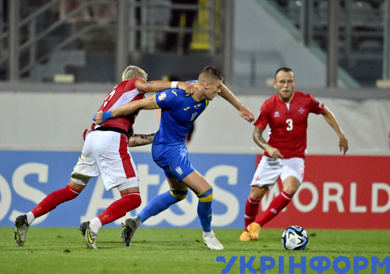 Нападник національної збірної України з футболу Артем Довбик (у центрі) під час матчу 8-го туру кваліфікації чемпіонату Європи-2024 проти збірної Мальти, що завершився перемогою української команди з рахунком 1:3, Та-Каліф, Мальта, 17 жовтня 2023 року.