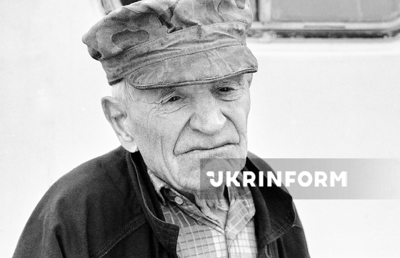 Житель 30-кілометрової зони відчуження 91-річний Костянтин Романов, який повернувся додому після обов’язкового відселення (евакуації) у дні аварії на ЧАЕС, отримав гуманітарну допомогу від представників Київської обласної організації Товариства Червоного Хреста України, село Куповате, Київська область, 25 квітня 2000 року. Фото Володимира Самохоцького.