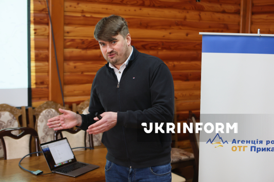 Експерт проєкту з питань місцевого самоврядування Павло Остапенко виступає з промовою під час зустрічі з експертами швейцарсько-українського проєкту DECIDE "Децентралізація для розвитку демократичної освіти" в межах конференції "Співробітництво, стійкість та місцевий розвиток громад в умовах воєнних викликів та перспектив євроінтеграції", Косів, Івано-Франківська область, 21 лютого 2026 року.