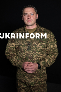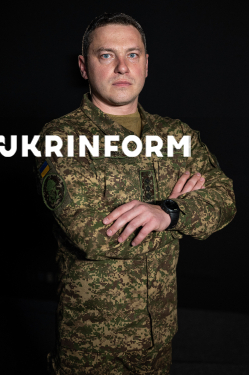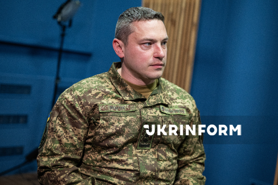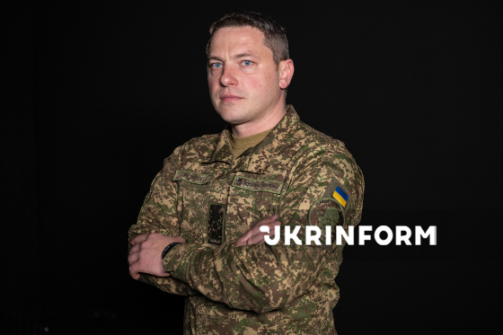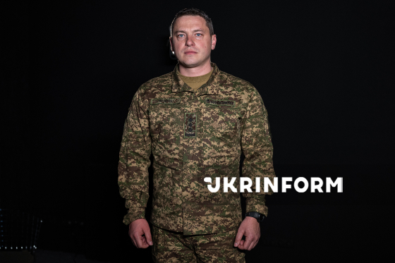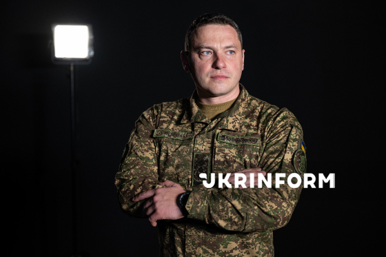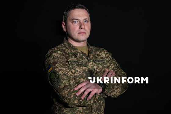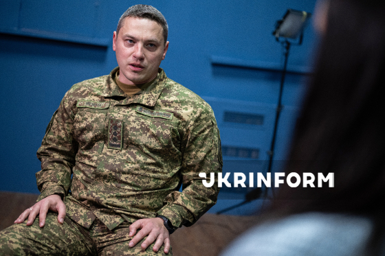 Речник Національної гвардії України Руслан Музичук позує для фото після інтерв`ю кореспонденту Українського національного інформаційного агентства “Укрінформ” Єлизаветі Чірниш, Київ, 23 березня 2026 року.