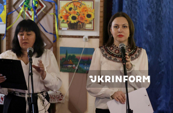 Завідувачка відділу "Музей Марусі Вольвачівни та історії села Черемушна" Валківського краєзнавчого музею Юлія Захарова (праворуч) бере участь у прем’єрі фільму-читання за мотивами драми мисткині в межах відзначення 185-річчя від дня народження поетеси, письменниці, громадсько-культурної діячки Марусі Вольвачівни (Марії Вольвач), Черемушна, Харківська область, 27 березня 2026 року.