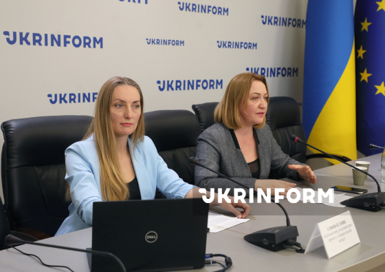 Політологиня, координаторка проєкту в Закарпатській області Софія Будник, керівниця проєкту, докторка політичних наук, професорка, заступниця голови правління ГО “ЦГІ “Інтелект Сумщини” Андріана Костенко (зліва направо) беруть участь у презентації аналітичного дослідження ”Інтегроване гендерно-чутливе відновлення громад: інструменти аналізу даних і сценарного планування” та онлайн-інструменту аналізу стратегічних документів громад GenPlan, Київ, 26 березня 2026 року.